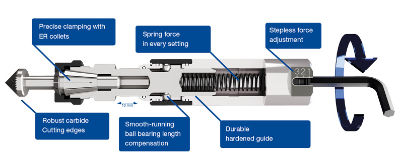 continuously adjustable from 2.6 N to 6.0 N - Deburring directly in the machine without manual