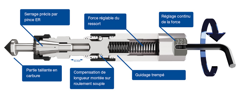 de 10 mm, réglable en continu de 2,6 N à 6,0 N - Ébavurage directement dans la machine sans re